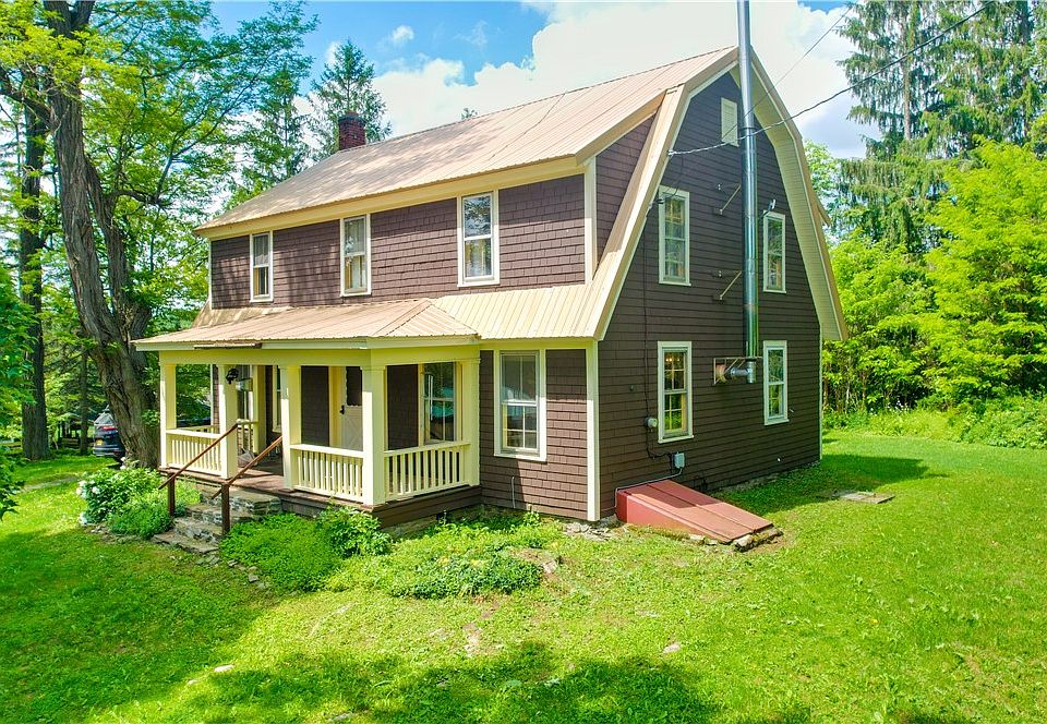 Welcome to your lovely country home nestled in the picturesque Fly Creek Valley close to Cooperstown! This fabulous Dutch Colonial Farmhouse sits on nearly 3 acres of serene beauty, offering you the perfect blend of rural tranquility and modern comfort. Step inside and be greeted by a completely renovated interior that exudes charm and elegance. The all-new kitchen boasts a thoughtfully designed layout with new stainless appliances, showcasing a farmhouse sink and butcher block countertops. Both baths first and second floor are tastefully redone. Immerse yourself in the warmth of this home with beautifully refinished wood flooring, highlighting an open living and kitchen area featuring a cozy propane fireplace, creating a welcoming ambiance for gatherings, along with the open family and dining rooms with a woodstove, adding another optional heat source for the home. This property also provides ample space for all your needs with an added storage room, an attached oversized 1-car garage, a sizeable shed and large lean-to, ensuring convenience in all seasons. The full basement, equipped with a commercial freezer unit, offers more storage and additional functionality.
