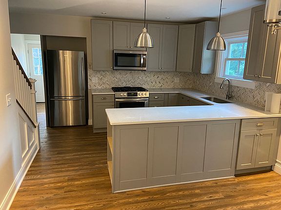 Step inside to discover gleaming hardwood floors that flow throughout the living spaces, leading you to a stunning kitchen featuring custom tile work, stainless appliances including a slide in gas range and distinctive quartz countertops. Every detail has been thoughtfully updated to create a fresh, contemporary feel while maintaining the home's character.