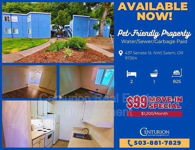 MUST READ MUST READ 1. Move-in Special ONLY applies to the current month. 2. The application process normally takes 1-3 business days. 3. Must see the property physically before the deposit is made. 4. If you have a pet, ESA or you don't have a pet you must register at https crem.petscreening.com 5. Apply to one property at a time. PLEASE READ, $1,100 FOR THE FIRST 3 MONTHS AND $1,200 THEREAFTER FOR THE REMAINING TERM OF THE LEASE. FYI, YOU MUST STILL MAKE 3 TIMES THE REGULAR RENT OF $1,200 IN ORDER TO INCOME QUALIFY Address: 437 Senate Street NW Salem, OR 97304 Property Type: Apartment Rent: $1,200/MO Deposit: $1,200 (On Approved Credit) Application Fee: $68/ per adult 18+ Tenancy: 1 Year Lease Bedrooms: 2 Bathrooms: 1 Sq. Ft: 825 Stories: 1 Stories Owner Paid Utilities: Water/Sewer/Garbage Tenant Paid Utilities: Tenant is Responsible for Electric, Gas (If Applicable), And all Other Utilities Pet Policy: Pets are subject to approval and will require: Additional deposit of $400/ pet, Pet rent may vary depending on Paw Score, Starting at $45 up to $100 per pet, 2 pets max 25lbs Ready Date (tentative): AVAILABLE NOW! Viewing Status: SCHEDULE SELF-VIEWING TODAY! Amenities Included: Fridge Stove/Oven Dishwasher (Pool & Fitness Room West Hill Village) Heat Type: Electric Floor of Unit: 2nd Floor Laundry: Laundry On-Site Parking: Off-Street Parking Landscaping: Owner Responsibility Pet Policy: Notice to all residents and applicants, everyone must complete the screening process. This is not only for pet and animal owners; it applies to residents and applicants who do not own pets. The pet policy includes caged animals and pets. Additional deposits and monthly pet rents will vary; keep in mind that it is subject to the approval of your petscreening.com profile. You will not be moved into the unit without this completed. Prices are subject to change, we do not guarantee prices, items change, and errors occur. If there is a discrepancy between a price online and a price in the office, supervising property manager shall have the final say. *Due to overwhelming demand we may be unable to respond to your rental inquiry. INTERESTED IN THIS PROPERTY? Properties are on a self-showing lockbox and each listing specifies how it is viewed. Feel free to drive by the property to check it out. "This information is deemed reliable, but not guaranteed." Centurion Real Estate Management, LLC 1365 Commercial St. SE Salem OR 97302