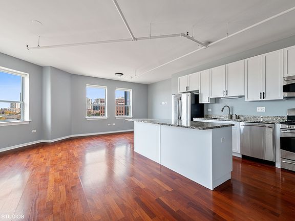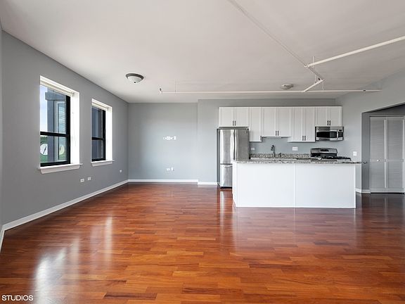 ParkSide, the new look of Old Town. Move-in ready large 1 bedroom condo with enough space for a living room, dining set, and office set up in a mid-rise elevator building. No space is too tight here from the moment you walk in, with a true entryway foyer, high ceilings, and a large coat closet. The walkway leads you towards the open concept living/dining setup facing a wall of windows bringing natural sunlight all day long with unobstructed views. Kitchen features granite countertops and stainless-steel appliances and an island comfortably seating 4 guests. Additionally, entertain on a nice sized balcony off of your living room which can also be used for grilling or to entertain. Hardwood floors throughout along with a large master, clean bathroom, and in unit washer/dryer. This pet and investor friendly building features an assigned 3x3 storage cage on the same floor, bike room, fitness center, LOW HOAs (gas and AC/Heat included!), and a secure mail room. Heated attached garage parking for additional $25k. Walking distance to Marianos, New City, Target, tons of restaurants and shops.