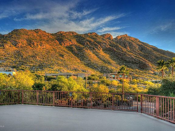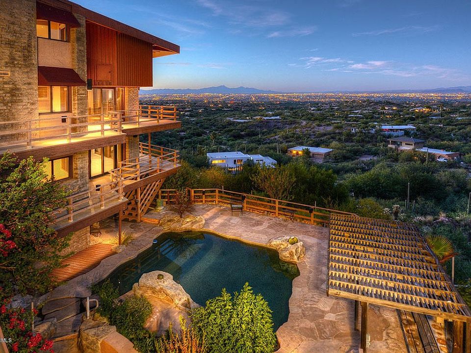 Architecture Designed to Extraordinary Views! Taking inspiration from the mountain itself, the residence is integrated into a central massive boulder and outcroppings. Set high in the Foothills, expanses of glass, wrapped in covered decks, afford Tucson's ultimate City Lights & Catalina Mountain Views. Enjoy the sparkling Solar Heated Pebble Tec Pool in a resort-like setting. Home provides an elegant venue for large scale as well as intimate entertaining. Top of the world huge deck. Secluded Master Suite with private Deck includes Grotto jetted Spool & Shower w/ stone waterfalls. The Pool (or Guest) House has a Bath, Closets and a French Door leading to that marvelous Pool. The total living area of over 4,400 Square Feet includes 5 Bedrooms, 4 1/2 Baths and three laundry locations.