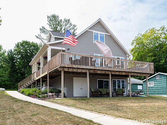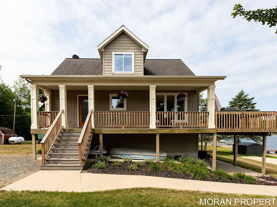 Here's your chance of a lifetime to own this piece of paradise! This 5 bedroom, 2 full bath cottage on all-sports Gunn Lake with some of the most amazing sunset views! The beautiful beachfront has a nice shoreline that offers fun for everyone! The open layout offers the perfect space for entertaining inside and flowing onto the deck extending the width of the cottage. Kitchen includes a nice snack bar and flows into the dining area with slider access onto the deck and the living room offers a wall of windows to the most amazing views. Main Floor Bedroom with full bath and Laundry Room complete the main floor. The 2nd Floor includes 2 generous size bedroom and another full bath. Continue to the Walkout level for 2 more generous bedrooms, nice size family room and storage room.