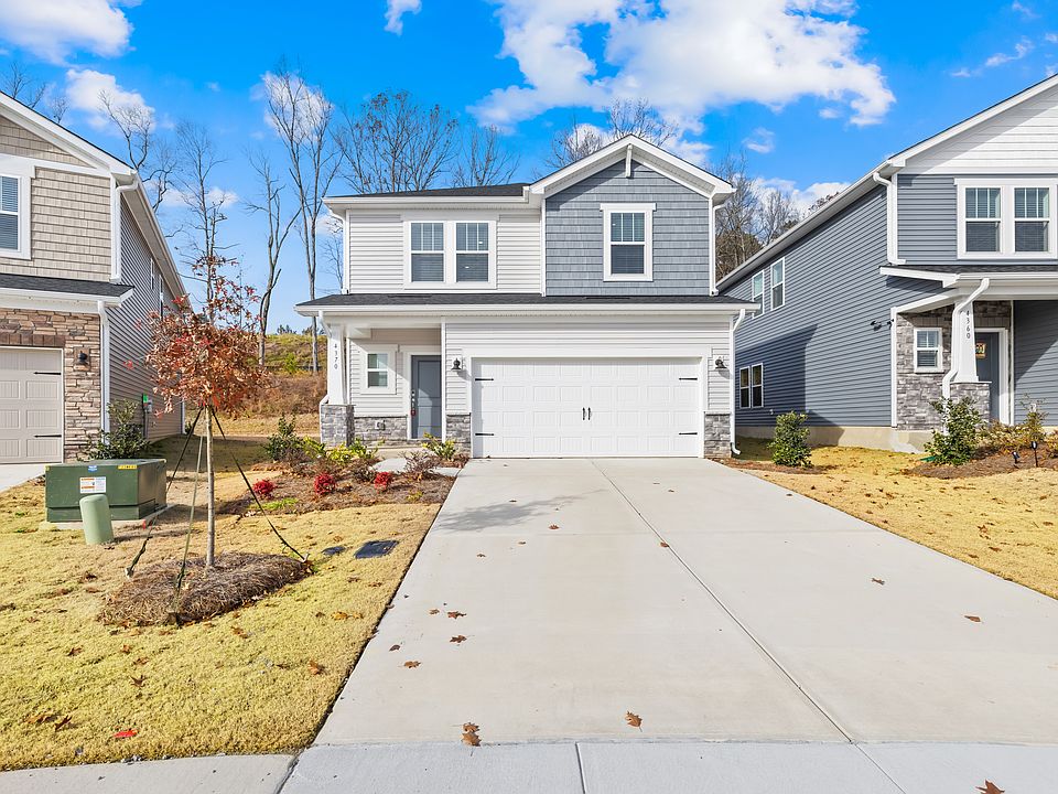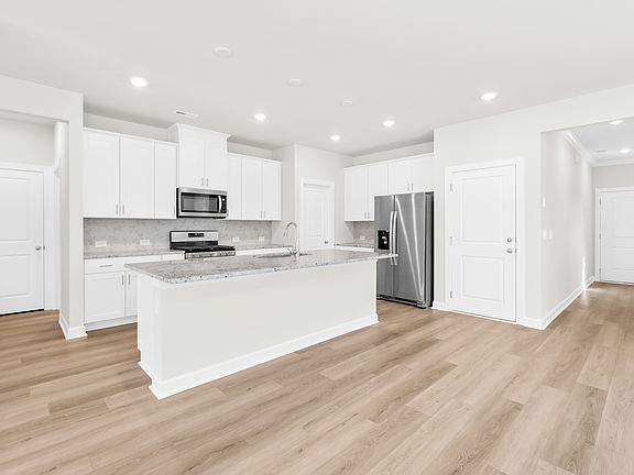 This brand-new, energy-efficient single-family home, nestled in a peaceful cul-de-sac within the Childers Park community, is ready for you! The first floor boasts a 2-car front-load garage, a private wooded backyard, a modern kitchen with white cabinets, granite countertops, stainless steel appliances, and a tile backsplash, as well as a spacious living room. A guest bedroom with a full bath completes the main level, offering convenience and flexibility.