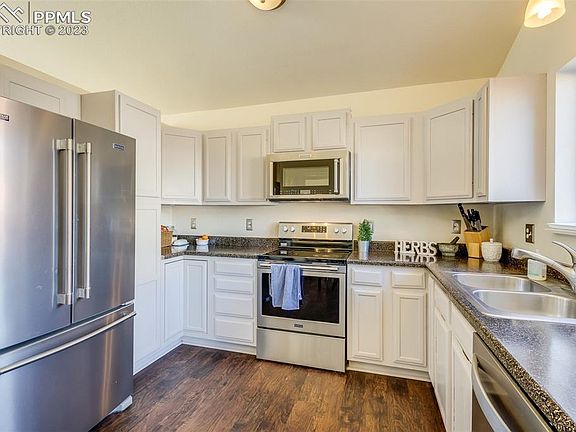 Welcome Home to an absolute gem, with over 1700 square feet, a large 2 car attached garage, and a beautiful surrounding neighborhood- one of THE best values in Colorado Springs! The home features 3 spacious bedrooms on the Upper Level, a nicely updated Main Level with a gorgeous Kitchen, and a fully fenced backyard with a deck and paver patio. The home is perfectly located literally steps from French Elementary and Community Open Space, with easy access to Peterson AFB, Ft Carson, and Amazon. The floorplan is open, light and bright, with a large Family Room and a true Master Suite- with double closets and an attached bath. The sellers have beautifully updated and maintained this home with stylish touches throughout- including the additional storage above the slider to the rear deck. This home truly offers one of the premier values in the region! Welcome Home!