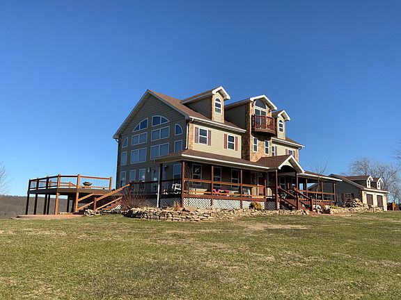 Southern Missouri Ranch with LIVE WATER, Whetstone Creek, plus other creeks and SPRINGS throughout! 350 Acres M/L with 3 homes, Executive Home with finished basement, 2nd Home (1BR guest house), and add'l 5BR home, Shops, Barns, cave, great grass, and Multiple Catch Pens/Working Facilities! The main home sits on top of a ridge with 360-degree views! Large decks, a pergola, outdoor fireplace, pool, and hottub are located to take advantage of the expansive views...even the chicken house has a view! The Main House features 2-story wood ceiling in living room, newer kitchen, and separate dining room off of the front entrance. The home's architecture takes the views into consideration with windows at every turn and numerous doorways to the wrap-around deck. The 2nd floor has the master suite and two additional bedrooms. The third level has space for an office and built in bunks and can sleep 8 people. The full basement has a living area, dining area, full kitchen, theater room, bedroom and full bath. It opens up to the back yard with a wall of glass. The shop is insulated and has a concrete floor on part and open bays in the back, that would also be a great place to add horse stalls. The Guest House/2nd Home is a one-bedroom/one-bath with a large living room, new kitchen, laundry room and wrap-around deck, shop, and also has 360-degree views. Property can easily have its own driveway. 3rd home is a 2-story 5-bedroom home with large kitchen, craft room, office, 9-foot ceilings and space over the 3-car garage for separate living space. Great Views Too! 100 acres M/L of bottom ground used for pasture, and additional upland pasture, there is plenty of hay ground and grazing. The currentl owner runs 100 beef cows. Fresh water is abundant and there are automatic waterers in working facilities. The wooded valleys, creek-bottoms and hills are a perfect place for deer and turkey! Can also be sold with 330 acres and 1 and 2nd homes for