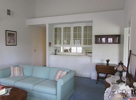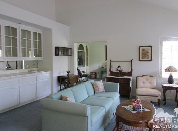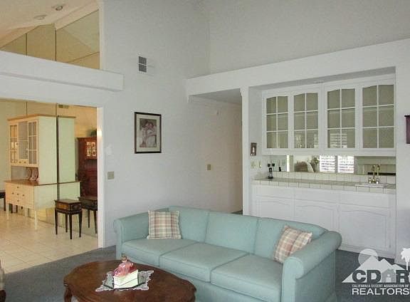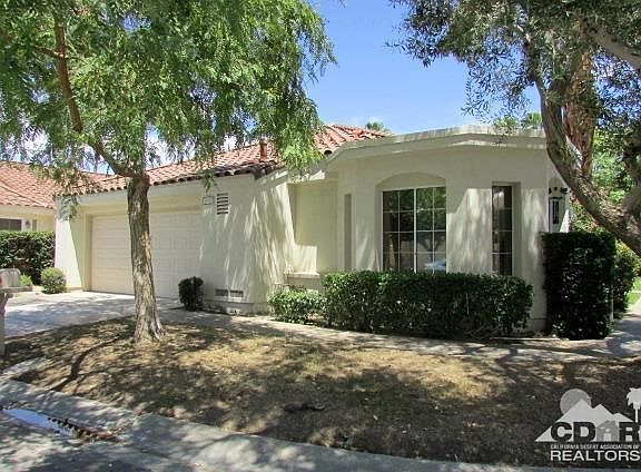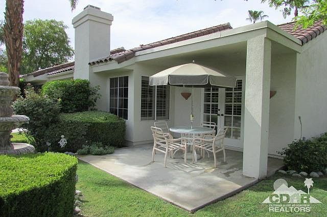 This home has a unique floor plan. There are 2 private patios off the family room and master bedroom. The kitchen is open to the breakfast room which is light and bright. Mountain views from the kitchen window. The interior features tile floors in the main living area. High vaulted ceilings make the rooms feel spacious. Other amenities include shutters, ceiling fans and more. In addition to the 3 bedrooms there is a den/office area with direct access to the patio. All dual glazes windows and patio doors for energy efficiency. A standard 2 car garage has direct access. A laundry room with additional storage is located off the garage. The yard is fully enclosed and lushly landscaped. Also close to the community pool/spa and clubhouse. The club house features a fitness center and tennis courts. This home is located in the very desirable Desert Sands Unified School District. Located close to shopping, restaurants and the freeway.