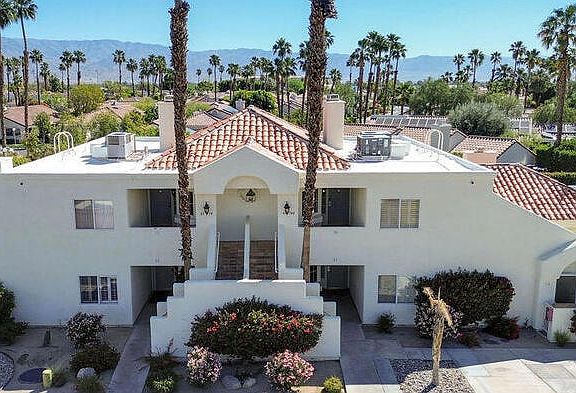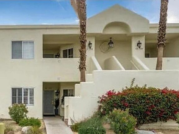 Welcome to the Villas at Desert Breeze. Located just minutes away from shopping, dining, golf, polo, hockey & schools along with easy access to the world-renowned BNP tennis tournament at the Indian Wells tennis garden and the Empire Polo Club (home of the famous Coachella & Stagecoach Festivals. This two bedroom, two bath lower level condo is just a few steps to the pool and across the street from the clubhouse and tennis courts. Featuring a kitchen with granite counter-tops, stainless steel appliances, a breakfast bar and opens to the dining and living area giving it a great room fee. You will find a cozy fireplace, a wet bar with cabinet storage and a pull down Murphy bed in the living room, perfect for extra overnight guests. The primary bedroom and en suite bath offer a walk in closet, dual sinks, granite counters, a tiled walk in shower and additional locked storage.The guest bedroom features mirrored closet doors and french doors with access to back patio and just a few steps to the beautifully appointed guest bathroom. Laundry closet with stackable washer/dryer is conveniently located in the hallway. One assigned covered parking space with ample guest parking available. Monthly home owner's fee include internet, cable, water, trash, clubhouse access w/fitness center plus multiple pools/spas and tennis & pickle-ball courts. One of a few remaining short term rental (7-day min) communities in the Desert.Perfect for rental investment, vacation or full time residency.