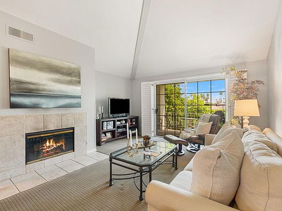 Charming Desert Breezes Condo - A Rare Upstairs Opportunity with Stunning Views. This beautiful upstairs condo in Desert Breezes offers two bedrooms, two bathrooms, and breathtaking views from every window. Situated in a serene, well-maintained community, this condo is a perfect vacation retreat or full-time residence. Unlike many units, this one offers elevated views of the desert landscape from your private patio. The home has been beautifully upgraded, featuring a spacious living room with a gas fireplace, wet bar and sliding doors that lead to an elevated patio perfect for enjoying the stunning sunrise. Plantation shutters throughout the home add a touch of elegance, while the upgraded kitchen boasts beautiful cabinetry, granite countertops, and stainless steel appliances. The open layout includes a spacious dining area and a kitchen bar seating for casual dining. Convenience is key with an indoor laundry area that includes washer and dryer. This property is ideally located just across the street from the world-famous Indian Wells Tennis Garden, so you can easily walk to the annual BNP tournament each March. Or, for you investors, you can command top dollar when renting this condo during the season and local events. Residents of Desert Breezes enjoy access to top-notch amenities, including a clubhouse with an exercise facility, tennis and pickleball courts, sparkling pools, and inviting spas. HOA fees cover Internet, Spectrum cable, Wi-Fi, water, and trash, making life here both easy and enjoyable. Don't miss the chance to own this upstairs unit with spectacular views and the added bonus of being completely furnished. It's the perfect place to call home!