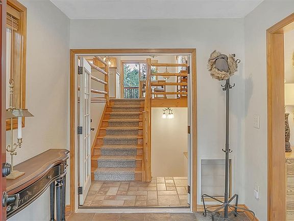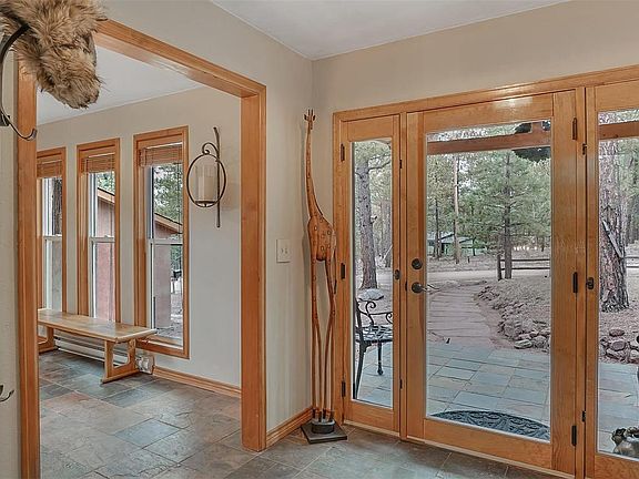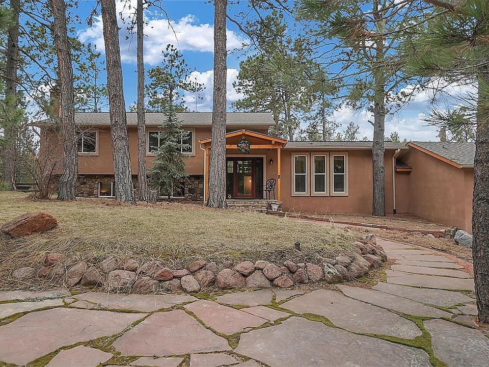 Truly a rare-unique find in the very desirable Black Forest, this is a fun place to live! Set in the midst of stunning tall pines, it overlooks its own gorgeous canyon w/rock outcroppings for the best views. This very private culdesac property expands to the other side of the canyon where you'll find your own private campsite, ideal for a summer evening party or overnight camping. Striking views from the kitchen of your property & Pikes Peak beyond. Located very close to everything, this property is brimming with appeal! - The portico & entry hall give a warm welcome you won't forget. As you enter, there is an attractive enclosed tiled breezeway/mud room that opens to the rear yard & connects to the extra large garage (30 x 24'). The eat-in kitchen walks out to the expansive deck & includes an almost new refrigerator. The expansive master bedroom has a built-in countertop space w/mini fridge perfect for a coffee bar, plus a roomy sitting area, walk-in closet w/builtins & adjoining bathroom. The lower level warmly greets w/ a neat built-in desk space & a stone gas log fireplace. The bright laundry room is large enough for exercise equipment too. Exterior of the home has been updated with stone and stucco. The campsite is serviced by its own zipline to send your supplies over! In addition to the campsite, this park-like setting has multiple outdoor entertainment areas close to the house w/a large flagstone patio, a 2nd fire pit area, a covered front porch & a spacious deck off the kitchen. On the east side, there is a track for racing mini bikes, 4 wheelers & remote controlled toys. To the west of the house there is plenty of room for additional parking including RV parking. Summer will bring lush green lawns to life. Sunny south-facing views, fully fenced & zoned for horses. - New Roof ; Newer Vinyl Windows ; Wood Blinds ; Well Filtration System ; Mini Fridge ; Storage Shed (12 x 18') - workshop or garden shed ; Murphy bed in lower level BR (minus mattress)