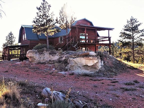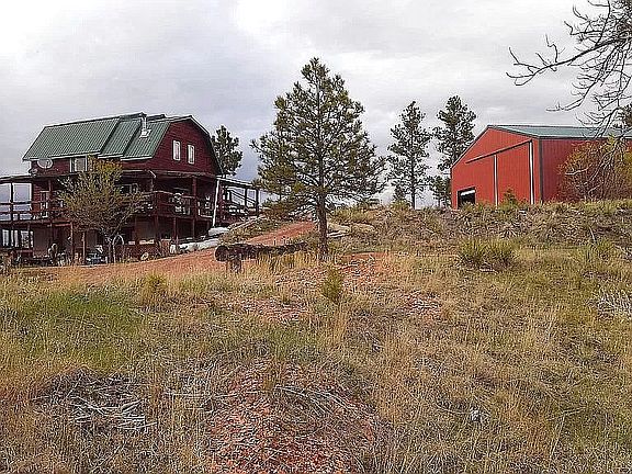 Lodge style home on 20 acres of rolling grass hills & timbered draws with an abundance of wildlife. Prime location in the vicinity of 1000s of acres of federal & state hunting land. Standing seam roof and covered wrap around decks to take in the stunning views. Rustic Knotty pine interior with heavily timbered cathedral ceiling and ceramic tile flooring. Main floor boasts a cozy wood stove & floor to ceiling windows that capture daylight. Open style dining, kitchen & living space w/full bath all flowing into family room. A Grand open-sided staircase ascends to a second-floor open concept balcony w/dual master suites. Suite 1 has a full jacuzzi bath & covered balcony w/ exterior stair access to ground level. Suite 2 has a 1/2 bath & lofty cathedral views. Walk-in basement w/doorwall access, utility room & 2 bedrooms. 40x70 pole barn w/2-14' sliding doors, a 9' overhead door & 25x35 concrete slab. Security system, digital reverse osmosis, water softener & transfer switch for power backup.