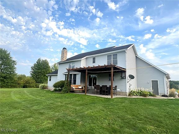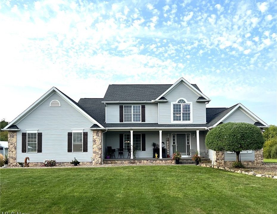 Set back 300 feet from the road, this home is on a beautiful 5-acre partially treed lot. A large concrete driveway leads to the property, which offers a perfect blend of rustic comfort and functionality. The property features an oversized two-car garage and a 20'x20' pole building with a concrete floor, garage door, and an awning/carport for additional parking. You will be greeted by a welcoming front porch leading to a two-story entryway with a winding staircase that sets the tone for the rest of the home. The updated kitchen, that features granite countertops, an oversized eat-in bar area, modern appliances, and a walk-in pantry. The kitchen, dining area, and great room flow to an open-concept design, creating an inviting space for entertaining. The two-story great room with windows that fill the space with natural light, bringing the outdoors inside. A wood-burning stone fireplace adds warmth and coziness to a space you will spend hours enjoying. The first-floor owner’s suite is complete with a large bathroom featuring a jetted tub, dual vanities, a walk-in closet, and a separate room for the toilet and walk-in shower. An additional room on the main floor offers flexibility as an office, workout area, or any other purpose you see fit. Upstairs, a balcony overlooks the great room and offers views of the backyard. There are two spacious bedrooms and a full bathroom on this level, perfect for family or guests. The partially finished basement provides space for activities and storage, offering endless possibilities to customize the area to suit your needs. Outside is a beautifully stamped concrete patio, ideal for entertaining or relaxing while enjoying the expansive yard prepped with power for a future pool or gazebo, adding to the outdoor potential. Kitchen including appliances updated 2011, Roof 2014, Hot Water Tank 2023. The home comes with a one-year home warranty.
