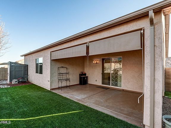 Welcome home to this wonderfully upgraded Granville 602 floor plan! Worry free OWNED SOLAR provides energy efficiency! Garage with 4 foot extension can accommodate larger vehicles, cabinets in garage will convey! Kitchen offers corner pantry, newer luxury Samsung appliances (yes the range is also plumbed for gas if desired), newer matte graphite kitchen sink. In addition to water filtration at kitchen sink, there is an Aquasana whole house water filtration system! Primary bedroom w/dual vanity and step in shower, large closet. Newer fans, lighting and window coverings throughout home! Adjustable sun shades on rear patio, Fully landscaped and private backyard with built in seating area to enjoy those Arizona evenings! Shed does convey. Granville community offers 3 clubhouses, pools,