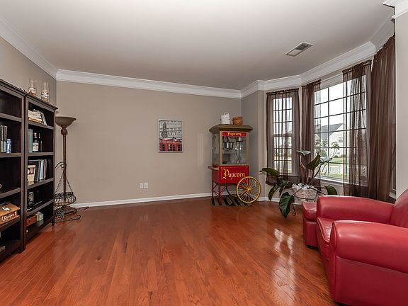 Two story maintenance-free vinyl home w/ stacked stone accents around the covered front porch. Enter to gleaming hard wood in the 2-sty foyer with decorative moulding. Hardwood flooring and moulding package continue throughout the main floor including the dining room, living room, and great room which also features a gas log fireplace and is open to the kitchen. Gourmet kitchen has gas cook top, double wall ovens, microwave, 42" cabinetry w/ moulding, granite counters, tile backsplash, and pantry! Guest room on the main floor shares a full bath. Dual staircases lead to owner suite with soaking tub, dual walk-in closets, oversized vanity with two sinks, stand up shower, tile floor and surrounds. Three additional guest rooms share a hall bath. Bonus room with surround sound and walkout attic space. One of the largest lots in the neighborhood backing to common area! Relax on the paver patio under the pergola with ceiling fan. Storage building near rear of the lot for extra storage.