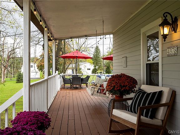 Charming three bedroom Colonial with tons of character on over an acre of land with detached 24x40 pole barn with electric and water. The home offers a nice floor plan with hardwood floors, updated kitchen with stainless steel appliances, breakfast bar with butcher block top, eat-in dining area, full updated bath on the first floor, living room with abundance of windows for natural light, gas fireplace, ample sized first floor laundry room with tons of storage. The second floor has generous sized primary bedroom with walk-in closet and newly updated bath with heated towel rack. Two addition bedrooms all with wide plank hard wood floors. The home sits on 1.3 ares with a wrap around porch great for entertaining or relaxing. The detached pole barn is great for storage/ workshop and has a second floor for additional storage. The barn has water, electric and has a conduit to the barn for internet/cable. The home also has natural gas and public water. All within a few minutes to the award winning Skaneateles Schools, and the village center to enjoy all the shops and restaurants.