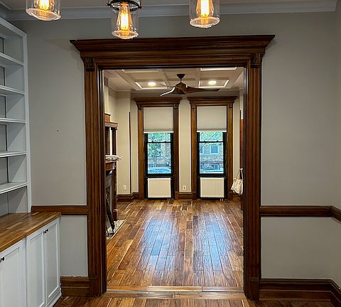 Living room, dining room, half bathroom, and kitchen on the parlor floor.