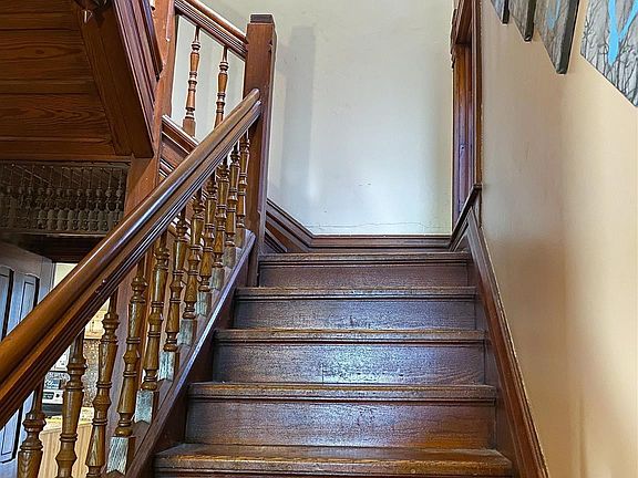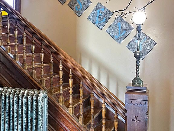 So much character with this 2 bedroom home that has a newer oversized 2.5 car garage! Some original hardwood flooring, Curtis woodwork, updated kitchen, tall ceilings, nice pocket doors in the living/dining rooms, and beautiful stained glass windows throughout. There is an addition with heated floors on the backside of the house that added a main level laundry room and a nice walk-in closet to an upstairs bedroom. Boiler and water heater were brand new 2 years ago. Main level has a living room with a beautiful tiled wood burning fireplace, formal dining room, bathroom, large kitchen, and laundry room. Upstairs a wide hallway with a storage closet, full bathroom, and 2 bedrooms- one with a second tiled wood burning fireplace. Relax or entertain on the front porch or on the back deck.