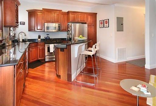 Bright and spacious brownstone condo in the heart of South boston. Open kitchen/living concept allows for great entertaining space. Hardwood floors throughout. Kitchen features stainless steel appliances and granite counters with plenty of cabinet space. Direct access to private deck off kitchen/living area. This unit has three generous size bedrooms with two full bathrooms. In-unit laundry, central a/c, ample storage. Common backyard.