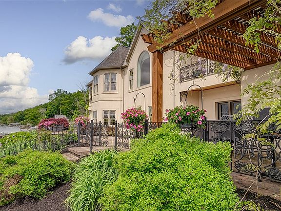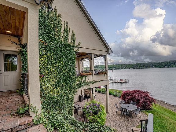 Once in a lifetime Keuka Lake home located on lower East Lake Road; this timeless 4000+ square foot home is essentially 2 full levels of living situated on 165+ feet of level shale beach. The stone exterior, lush landscape & double french doors welcome you to easy one-level living. Vaulted ceiling living room with huge lake facing windows. The new kitchen has luxury appliances, & walk in pantry. Dine in the formal dining room, lake-facing kitchen nook or the private covered deck overlooking water. First floor primary ensuite with balcony, en suite bath, tile shower & walk in closet with private entrance to glassed in grotto hot tub area to stone courtyard! Office space, & laundry with 3 car attached garage complete first floor. Lower level has casual living area with bar, second kitchen, half bath, laundry, & 2 large bedrooms with doors to the lake. The billiard room & second office offer additional flex spaces. The wrap around hardscape patio area features many outdoor entertaining spaces. Gentle access to the shale beach and 2 docks. Built by high end local builder, the character & quality shine in this home; meticulously designed & impressively built for elevated lake living.