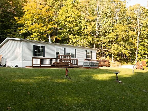 This immaculately maintained property offers so much for the buyer looking for cozy comforts, privacy, amazing views. The living room is large, with an open floor plan and dining area. The focal point of this space is the stone hearth with wood burning stove. The kitchen has stainless steel appliances, ample counters and laundry area. There are three bedrooms, two full baths, with the primary bedroom offering a huge walk in closet, large bath with garden tub and skylight. Outside the large yard with space for all your gardening, both vegetable and flower will love this sunny space. Also enjoy seasonal amenities, including a pool, a large deck for enjoying those long range easterly views, and a hot tub. Detached one car garage with power.