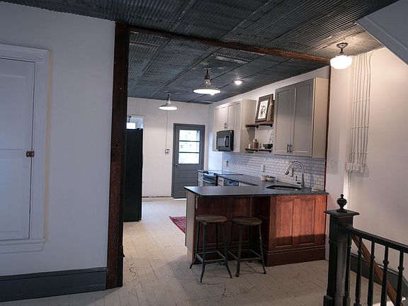 Back in February my wife and I purchased the home next to our own house. We had moved to Pennsburg four years earlier seeing potential in the town and the fell in love with the understated early Edwardian architecture. After several months of work, we are putting the final touches on the first of three units, which will be ready for move-in July 1st. Our first completed unit is a two bedroom/one bath that occupies the second and third story of the house. We tried to bring back and celebrate as much of the early 20th century character as we could, while also providing modern conveniences. The main floor has an open concept with painted original hardwood floors. The ceiling is reclaimed barn siding from Chester county and is illuminated by 1960s gym lights out of a local elementary school. The kitchen has new soft close cabinets and leathered granite countertops. The bathroom has been expanded with a tile shower, marble double vanity, reclaimed tin ceiling shelving and oversized mid-century mirror. Trim throughout the main floor is from a recent renovation in Schwenksville and shows over a hundred years of different paint colors. While patching walls in the first floor we discovered two pocket doors that had been sealed over since the 1970s. One of the doors now adorns the entrance to the main bedroom, proudly displaying its August 18, 1891 patent date in original yellow paint. Inside the bedroom two exposed brick walls tie together the walk-in closet to the rest of the room. The entrance to the second bedroom on the third story is a celebration of all the wood scraps we pulled from the renovation, highlighting a reclaimed Victorian door in the middle. In addition to architectural details, the apartment has updated windows and electric baseboard heat. A unit specific washer and dryer is provided in the basement with a sink and laundry area. There is one off street parking spot for the unit; two if you stack the vehicles. There is outdoor seating provided in the fenced in backyard which is lined by roses and ornamental grasses. Location wise the apartment is on Main street with direct access to 663 and 29. It is stumbling distance to Dunkin Donuts and Sweet Melissa s vegan bakery; walking distance to Weis and Tosco s, and a five minute drive to the Quakertown exit of the Northeast Extension. We are still in the process of finishing up the small details and the apartment will be ready for July 1st. If you would like to come look at the apartment or have any questions, please send email. $1200 a month. First and last months rent due at signing. Security deposit. Owners will cover water, sewer and trash. Electric and internet responsibility of tenant. No smoking. Litter boxed trained animals only with additional fee. 1 month or 12 month lease availible/Tenet pays electric and cable