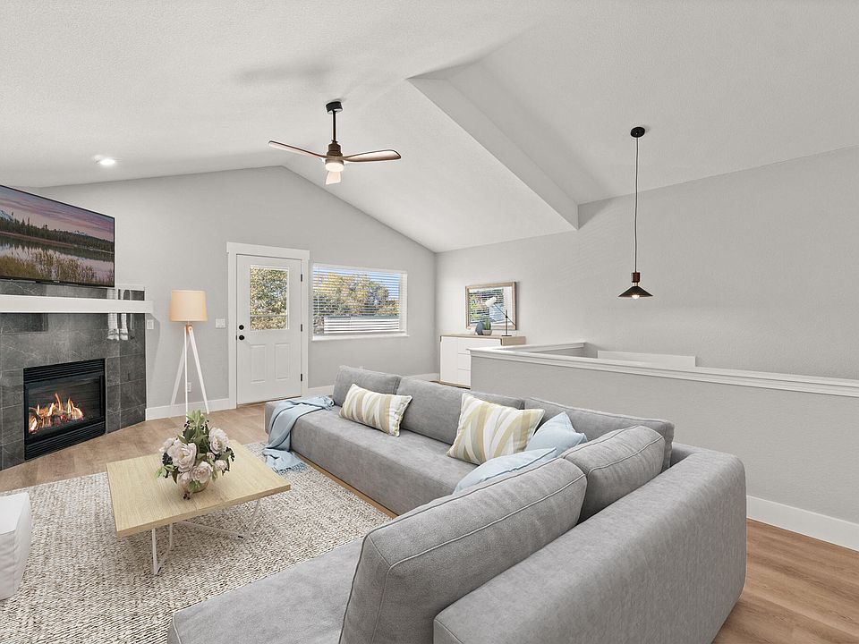 The open floor plan townhome is beautifully renovated. 1,573 square feet, 3 bedroom, 3 bathroom townhouse will absolutely amaze. With vaulted ceilings, all-new flooring, countertops, interior paint, lighting fixtures, and fresh epoxy garage flooring, this home is a sight to behold. Step outside to your spacious deck and be captivated by the charming 'peek-a-boo' mountain views that will make this an extraordinary home at an incredible value. The sellers are generously covering 3 months of HOA fees, making this home purchase a standout opportunity.