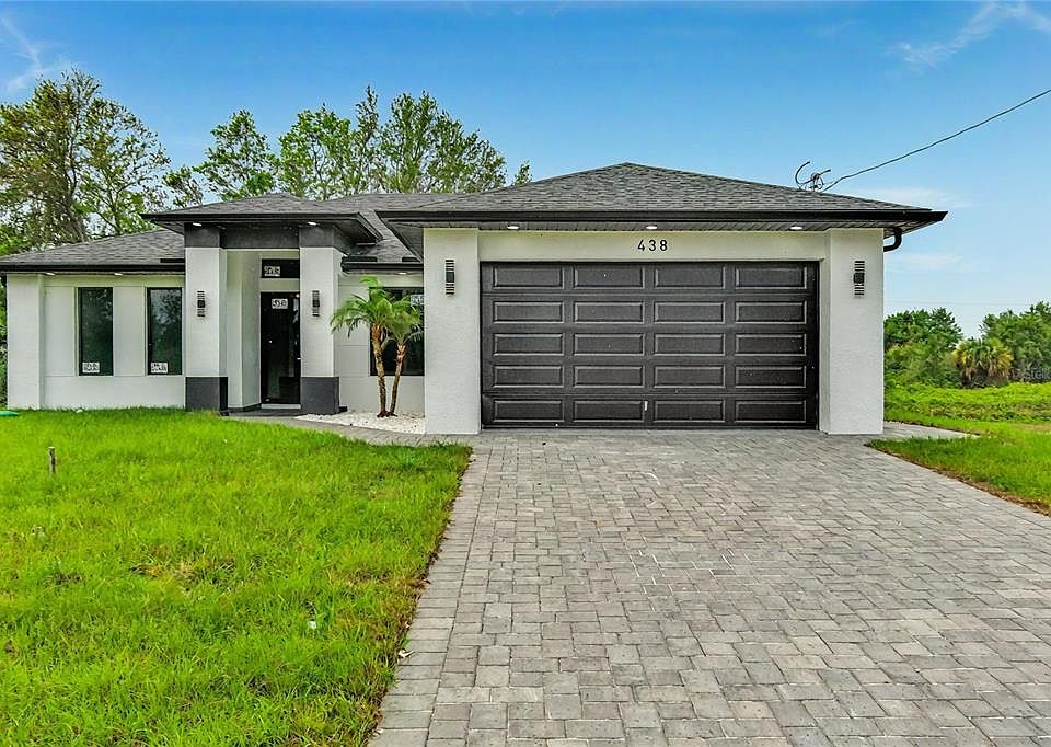 Introducing an exquisite new construction property that perfectly blends modern elegance and comfort! This stunning home features 3 spacious bedrooms plus a versatile den, ideal for a home office or guest room. Enjoy the luxury of 2 beautifully appointed baths and the seamless flow of tile flooring throughout the entire house, enhancing both style and practicality. Step outside to your own private lanai, perfect for relaxing or entertaining. The coffered ceiling and impressive 9-foot doors add a touch of sophistication and grandeur. Thoughtfully designed closet cabinets provide ample storage, while the charming paver driveway completes this beautiful property. This home is a true gem waiting to welcome you—don’t miss the opportunity to make it yours!