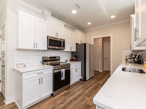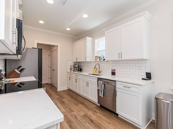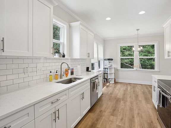 Welcome to this beautifully crafted 2023-built Craftsman-style home, designed with modern elegance and superb curb appeal. Nestled just minutes from dining and shopping in one of the northern Triangle's most vibrant up-and-coming downtown districts, this home offers both style and convenience. The full rocking chair front porch invites you in, where warm luxury vinyl plank floors and sophisticated crown molding greet you on the main level. The kitchen boasts white shaker panel cabinets with cove crown molding, stunning quartz countertops, a subway tile backsplash, and stainless steel appliances. Recessed lighting and ample windows fill the space with natural light, while a window above the sink adds a charming spot for plants or herbs. The adjacent dining area features a sleek 3-bulb chandelier, and the family room is bright and inviting, complete with a brushed nickel ceiling fan. Upstairs, the primary suite is a serene retreat with plush carpeting, a large en-suite bathroom offering tile flooring, dual vanities, white cabinets with quartz countertops, a walk-in shower, and separate water closet. Enjoy the outdoors in the flat backyard with a concrete patio—ideal for relaxing or entertaining. Don't miss this opportunity to live in a home that combines modern amenities with Craftsman charm in an unbeatable location!