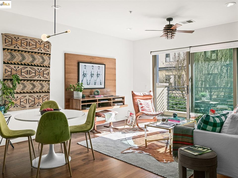 #523 is unlike other units in the Broadway Grand building, and that’s exactly why Susie and Ellen selected this prime pad when they purchased it directly from the developer. While they wanted to live in the vivacious downtown area — in a 99 WalkScore® neighborhood close to BART, dining, bars, coffee shops, and Oakland’s vibrant art scene — they fell in love with the softer side of unit 523. The light-filled rooms, a bedroom with a charming window seat, and a private balcony overlooking the landscaped courtyard made this home feel truly special. This highly functional unit features recessed lighting, in-unit laundry, a custom-built media center by Jason Lees Designs, and a sizable primary bedroom with a walk-in closet and custom wardrobe system. Over the past 17 years, Susie and Ellen enjoyed eating lunch on the balcony while watching hummingbirds, opening the patio door to let the breeze and fresh air flow in, seeing their cat sunbathe on the balcony, and strolling through the neighborhood. Their favorite local spots included the Y gym, walking around Lake Merritt, frequenting Sweet Bar Cafe, Farley’s East, and enjoying the firepits at Drake’s Dealership. The building boasts modern upgrades and other amenities for today’s lifestyle.