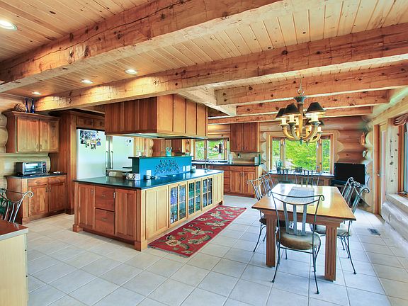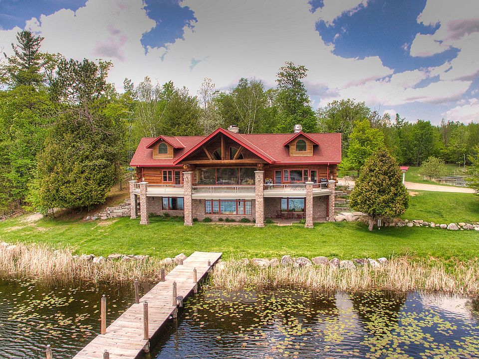 TRUE NORTH - One of a kind log home with private, spring-fed 5 acre lake located 12 miles from town, near hundreds of acres of state land. Constructed of hand-peeled, Scandinavian full-scribed Norway pine logs and hand-hewn beams. Full walk-out basement clad with Belgian red granite blocks and granite columns. The southern exposure home has attached three car heated garage, cathedral ceiling great room, natural stone fireplace, two pantries, third level den and bunk room. Lower level has two ensuite bedrooms, an ornate cherry bar, pot belly stove, billiard table and small functional summer kitchen. Located in northern Michigan in the heart of the golf mecca and an area with abundant lakes, this property has easy access to hunting, fishing, snowmobiling, ORV trails.