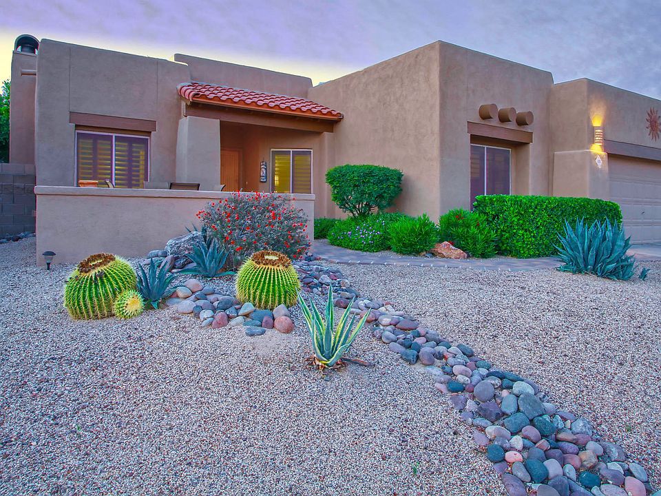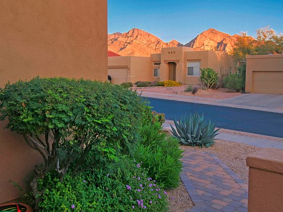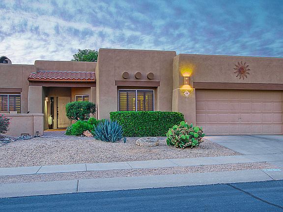 Model like home tucked in a popular Oro Valley community. Great room plan w/wall of windows perfectly framing the professionally landscaped rear yard w/blooming desert flora & tranquil pool. Split bedroom layout, high ceilings, custom 4'' wood blinds & 18 x 18 tile in all main areas. Designer accent colors add distinctive appeal highlighting the architecture. Kitchen hosts large island, natural wood cabinets & separate pantry. Den w/double doors easily doubles as office/formal dining rm. Master retreat w/walk-in closet, dual sinks, garden tub & separate shower. Sliding glass door from master ushers you to rear yard w/lrg cov'd brick paver patio & hot tub. The perfect spot to enjoy AZ outdoor living.