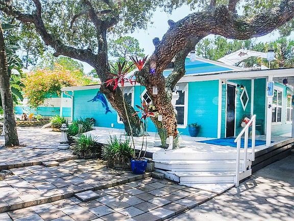 Truly original design and decor make this Tropical Key West style oasis a one-of-a-kind find! The home is nestled in its own fenced-in compound, complete with pavers and lush landscaping. It truly has a resort feeling. Inside, the kitchen is the heart of the home with its gorgeous countertops, backsplashes, and custom cabinetry. This home comes fully furnished except for some original art and the guest bedroom furniture. The property also includes a large workshop and a guest Airstream. Lastly, this home is adorned with a rooftop lookout deck for sunset views. Despite being close to all the beauty of the Gulf of Mexico, this property is not in a flood zone, as it has remained dry during the past hurricanes. Down the road is the Bayport Park Boat Ramp, Pine Island Beach and Hernando Beach restaurants and bars with live music. The HVAC system is newer (2021) with a metal roof. This vacation style home IS a "stop the car," moment!