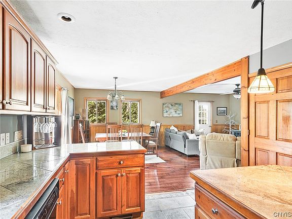 Welcome to 4380 Jordan Road! Located in the award-winning Skaneateles Central School District. Just minutes away from the village shops and restaurants. Secluded 3 bedroom, 1 1/2 bath cape cod on a private wooded lot. The open kitchen offers cherry cabinets, granite countertops, island, and tons of storage! Have the convenience of laundry on the first floor. Two large storage closets off the kitchen, along with a walk-in pantry. Enjoy an open floor plan walking into the dining area and living room. Walk out of the sliding glass doors onto the 2-tiered deck! The primary suite also located on the main floor offers exquisite french doors that open up to a serene back yard. There are two sheds offered on the property for storage. The upstairs includes two additional bedrooms, half bath and two large closets. This home offers an abundance of built-ins for extra storage. Get cozy and enjoy complete privacy. House is not visible from the road. Please pull up driveway and follow arrows to view.