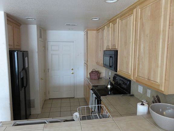 Bright and open main level with hardwood floors. Large kitchen with tile counters w/full tile back splash and tile floors, all black appliances, cabinets with crown molding and a pantry. Main level has a half bath with pedestal sink. Upstairs features three bedrooms with the master having a walk in closet and 4 piece bath with double sinks, a large oval soaking tub and private balcony. Vaulted ceilings with decorative ledges. Two more bedrooms upstairs with a large full bath to share. A/C, washer and dryer included, private front terrace/patio