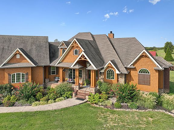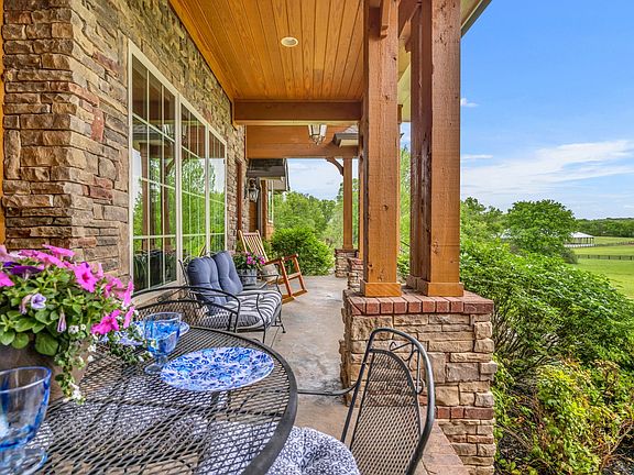 Experience this remarkable showplace's unparalleled beauty & tranquility, every detail has been thoughtfully designed to create a truly exceptional living environment. Extraordinary Custom-Built modern rustic resort-style oasis on 16 rolling acres within a gated entry. Expansive lodge rm w/ 30’ ceilings, king post beams, floor-to-ceiling windows & stone fireplace. Chef’s kitchen w/granite countertops & stone arches. Hearth room w/specialty ceilings, stone FP, & covered deck. Breakfast area overlooks screened-in porch w/ FP and TV. Stone-encompassed patio w/ SS grill. Owner’s suite with sitting area, double tray ceilings, and luxury spa bath with 10' shower & clawfoot tub. +2 en-suite bedrooms, enormous rec room w/ pool table/walk-out storage, media/gym room. In-ground pool with sunset views, 1B/1BA guest house, natural stone firepit. Fresh paint, refinished hardwood floors. Spring.$5,000 lender credit available towards the buyer's CC & PP, preferred lender, not exceed 1% of loan amount