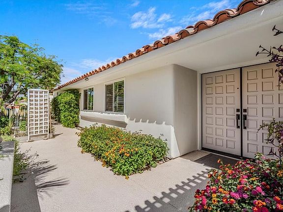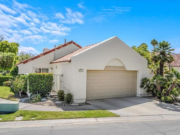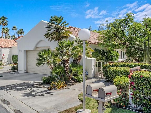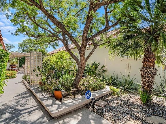 This stunning three bedroom, two bath, detached former model home, is ideally located on a quiet cul-de-sac. Set against a backdrop of breathtaking desert landscapes, the private gate leads to a lush, tranquil garden, adorned with birds of paradise, fragrant plumeria, producing banana trees, colorful flowers, and more. Unwind under the stars, in the large pebble tech jacuzzi, which has been recently polished and upgraded, with a tile and stucco base. A private sidewalk off the back of the home leads to walking trails, the clubhouse, and tennis courts. Inside the home, high ceilings and windows, create a sense of warmth, openness, and natural light. The living room is set off the patio, and features a fireplace, perfect for cozy evenings with loved ones, or entertaining guests in style. Create delicious meals in the spacious kitchen, and serve guests in the bright, open dining room. The modern guest bathroom boasts under cabinet lighting, a floating cabinet, and a luxurious bathtub. The primary suite has a private outdoor patio, with incredible mountain views. Large closets make storing your personal belongings easy. The primary bathroom offers a spa like escape, with a contemporary walk in shower. The attached two car garage makes daily tasks effortless and efficient. Some updates include a newer HVAC, LED lighting, and low E windows. Desert Breezes is convenienty located to The Indian Wells Tennis Gardens, shopping, dining, and entertainment.