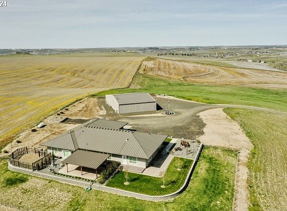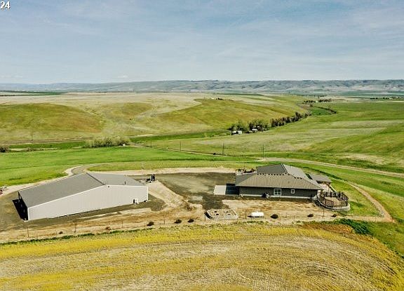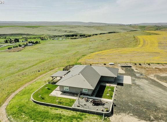 Enjoy breathtaking vistas from this custom luxury home perched on 161.57 acres located just minutes from Pendleton. This contemporary 4 bedroom, 3 bathroom home offers 3,396 sf of one level living. The modern open floor plan features the fully appointed "chef's kitchen" creating the perfect space for entertaining. The home was constructed with great attention to detail and includes double wall construction, triple pane windows, insulation exceeding code and a finished 900sf attached garage. Relax on the covered patio and enjoy the exceptionally landscaped outdoor space. Additionally includes a 6,000sf shop with office and bathroom. The shop is designed to park an RV and features 4 12'x14' insulated overhead doors, 2 smaller doors, 2 post vehicle lift, 200 amp electrical panel, workbench/cabinets and commercial air compressor. RV parking with electrical hookup and dump station. Seasonal artesian well with 4,000 gallon cistern. List of additional features available upon request. With the large acreage there is plenty of space to add a barn, outbuildings and corrals for horses.