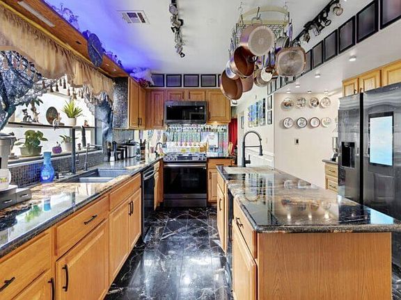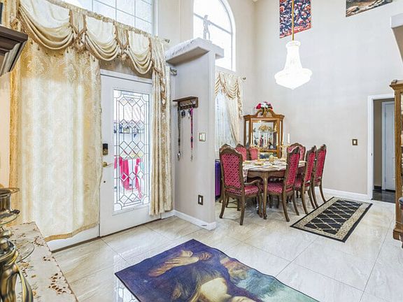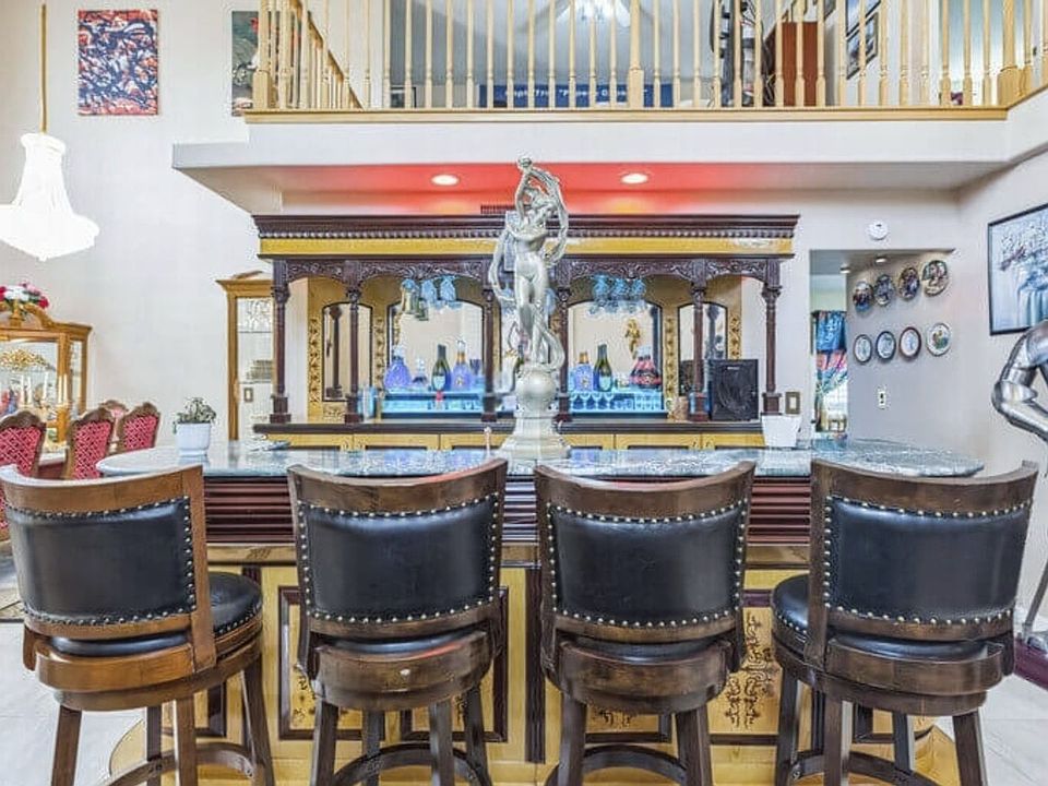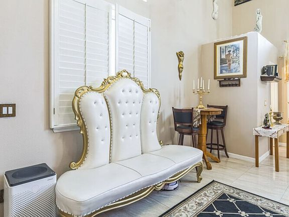 Fully furnished One of a Kind luxury 3-bed, 2.5-bath oasis in a quiet Las Vegas cul-de-sac, just 10 minutes from the Strip and 5 minutes from Harry Reid Airport. This 2,400 sq. ft. home blends high-end finishes with bold design. Enter a grand 20-ft parlor with a Milanese wood bar, life-size knight, Egyptian statues, and fine art. The chef's kitchen features granite counters, dual microwaves, island sink, and instant 200 hot water. A versatile upstairs loft adds extra space for reading, relaxing, or working from home. The primary suite offers a king adjustable bed, private A/C, 85" TV, chandelier, mirrored closets, sauna, bidet, and soaking tub with Roman columns. The private backyard features a hot tub under a gazebo, outdoor kitchen, tiki bar, fountains, and custom lighting. Solar for energy savings. Smart TVs, stocked kitchen, and washer/dryer make it move-in ready. Artistic details, curated decor, and resort-style amenities elevate this one-of-a-kind home, conveniently located near parks, shopping, and top entertainment.