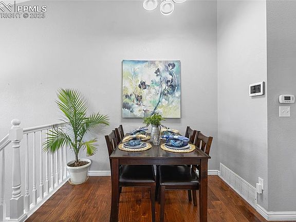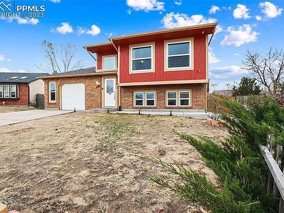 Nestled in the southeast neighborhood of Heritage, this stunning bi-level home is a remarkable home! Located on a quiet cul-de-sac lot, this property boasts 4 BRs and 2 bathrooms. No HOA dues. Enjoy the Colorado sunshine from the front porch. As you enter through the beautiful front entry door with leaded glass inset, you'll find a light and bright open floor plan with vaulted ceilings and 1797 square feet of comfortable living space. The ceiling fans and central air ensure that you'll always be comfortable. Step up to the dining area which features gorgeous wood floors and leads to the vaulted living room, which is flooded with natural light thanks to its large windows. The kitchen is equipped with a tile floor, pantry, and cabinets with attractive countertops, along with stainless steel appliances that include a smooth top range oven, built-in microwave, dishwasher, and side by side refrigerator. The wood deck outside provides stunning mountain views, making it the perfect spot for enjoying your morning coffee or watching the sunset. The upper-level features two bedrooms and a full bathroom. The vaulted primary suite boasts neutral carpet, double closets, and an adjoining bathroom with a tile floor, vanity, and tub/shower. The 2nd upper-level bedroom provides neutral carpet and a generous closet. The lower level hosts a spacious family room, laundry area with washer and dryer that stays, two more BRs, and another full bathroom. With an oversized 1-car garage and a storage shed that has electricity and could be turned into a work shop, you'll have plenty of space for your tools and toys. The fenced backyard includes a deck and a dog run for your furry friend, and there's additional parking on the side yard for a small RV or boat. Conveniently located close to parks, trails, and playgrounds. Easy access to Fort Carson, Peterson AFB, Powers Corridor, I-25, and Fountain Creek Regional Park. This home is ready for you to call it your own!