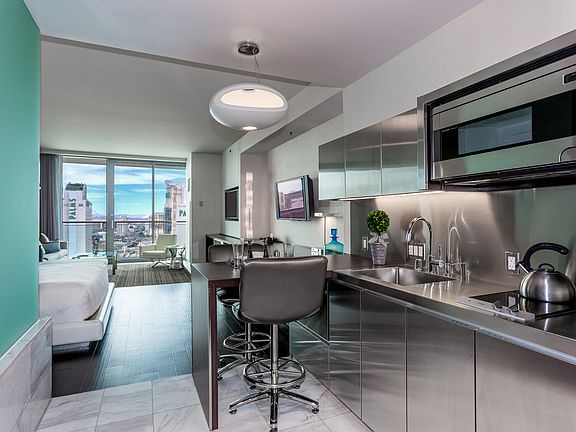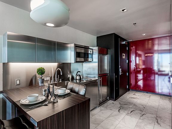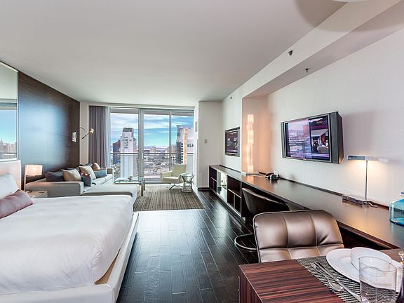 Fully furnished condo with a king bed, sofa sleeper, rainfall glass enclosed shower, free standing tub, stainless appliances & breakfast bar. The kitchen is outfitted with a fridge, cook top, dishwasher, microwave, all small kitchen appliances, dishes and utensils. The condo has a terrace and is a center unit with swimming pool, strip and Allegiant stadium views. World class amenities spa, fitness center, pool, dining and complimentary limo service. The property is a condo hotel and allows a lot of flexibility including short term rentals.