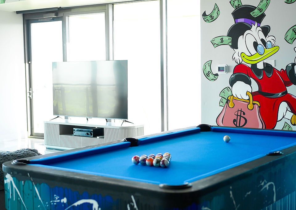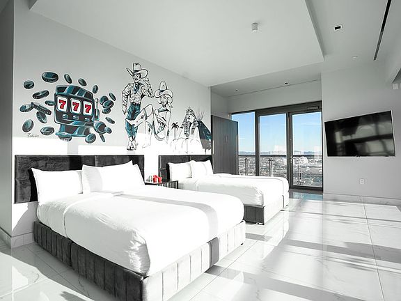 VEGAS, BABY! Perched on the 55th floor, this 3,400 sq. ft. newly renovated suite offers breathtaking views of the Las Vegas Strip and surrounding valley. This sleek, stylish retreat features 2 bedrooms, 2.5 bathrooms, and a spacious living room with a cozy sitting area to admire the skyline. The master suite boasts a private sitting area and large soaking tub. For fun, enjoy shuffleboard, a pool table, table tennis, and a private hot tub, all surrounded by vibrant murals from local Vegas artists. The perfect blend of luxury and excitement awaits!