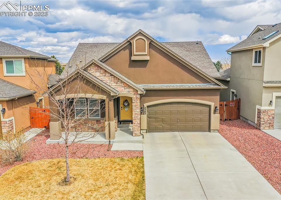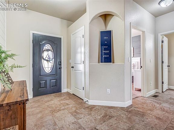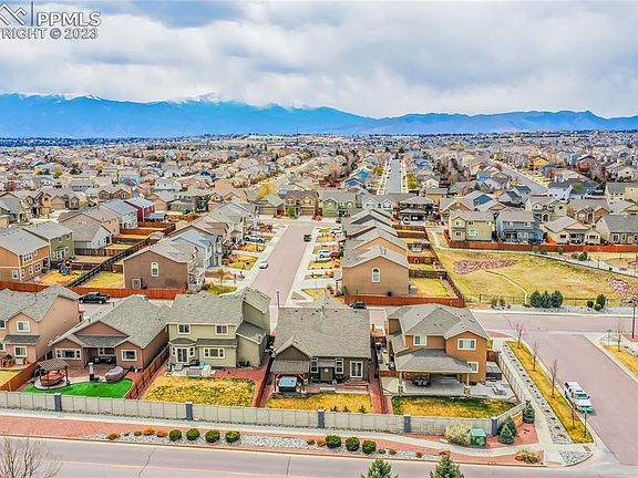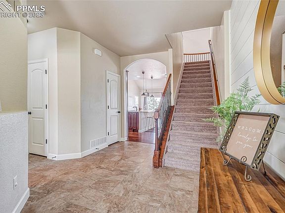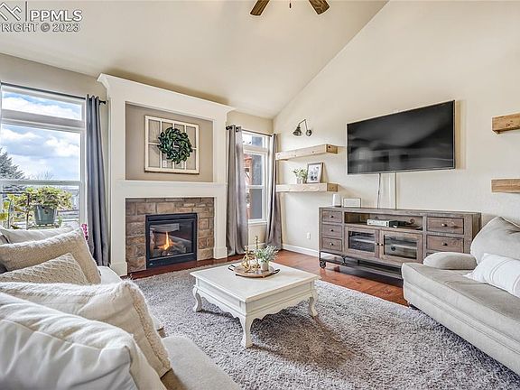 This home is an absolute show-stopper! With so many custom touches you will surely be captivated by the finishes throughout this home. The stone fireplace with a white mantle is a centerpiece of the living area, while the soaring ceilings add to the grandeur of the space. The open floor plan features exquisite hardwood flooring, designer lighting fixtures, and lovely design choices. Enjoy a view of Pikes Peak out of the main level bedroom and the covered front porch. The upper-level loft is great for a study, workout area, play area, or whatever suits your needs. The large finished basement is perfect for an entertainment area, complete with a theatre and ample space for entertaining or relaxing while watching the big game. Head out to the backyard and find a custom concrete patio with a gas fireplace and hot tub. A park just steps down the street provides a serene backdrop for outdoor activities and lots of fun. Located within walking distance to Rocky Mountain Charter School, and just minutes from shops and restaurants, this location is ideal.