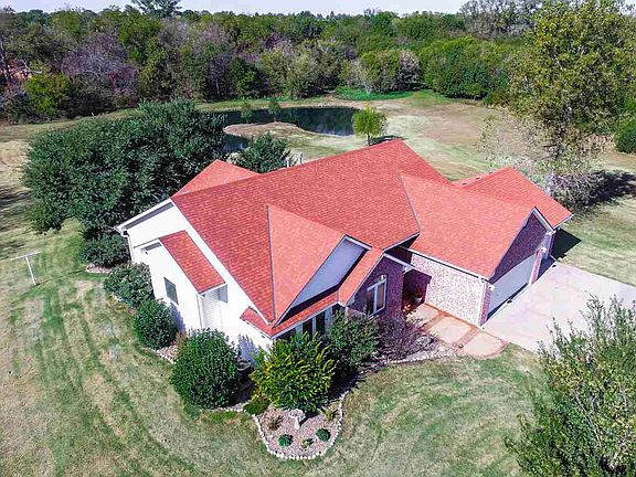Amazing country retreat just minutes from Andover! Imagine owning your own private lakeside home on 10 wooded acres with highway access! Feel like you’re on vacation every night when you come home to your own hiking trails meandering through the over 3 acres of woods and along the creek. Or just sit and enjoy the views of the pond and woods from almost every room in the home. Immaculate and move in ready with popular open floor plan, vaulted ceilings and expansive views of your own private paradise! Entertaining large groups will never be easier. With the spacious dining area, island seating and deck access, your options are endless. You’ll appreciate the easy to clean solid surface floors including hickory hardwood on the main level, and ceramic tile in kitchen and basement. The master suite has a spacious walk in closet, jetted soaker tub, separate sinks and a gorgeous glass shower. Hard to find concrete storm shelter in the basement complete with steel doors provide an extra layer of security. Water backup sump pump ensures operation even with power failure! Generous sized bedrooms and expansive family room make an ideal floor plan for the large or active family. The fully insulated and sheet rocked garage with epoxy floors provide a great area for weekend projects. An additional storage building has room for the mower and power tools. Rural water for the home and well water for the landscaping and property make it economical to have a lush green oasis all summer. Located just minutes from Andover, Augusta, 10 minutes to Wichita and just 20 minutes to El Dorado you can truly get away from it all without getting away!
