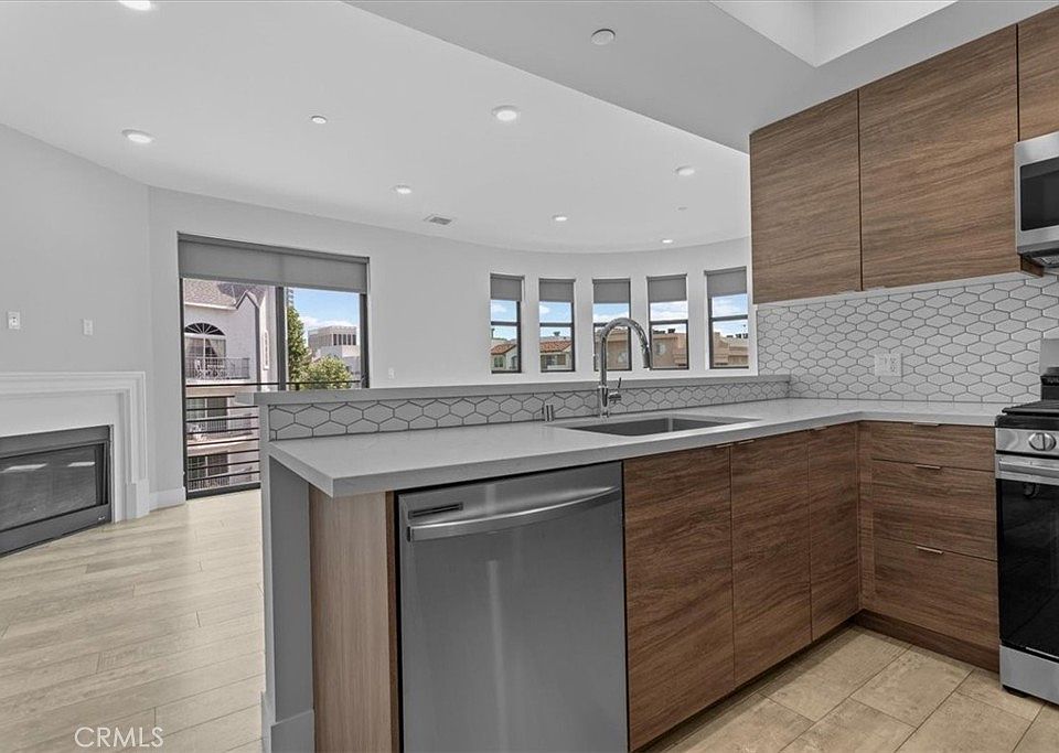 This fully remodeled unit features stainless steel kitchen appliances (refrigerator, microwave, dishwasher, oven), quartz countertops, walk-in closet, triple pane windows and fireplace. This unit also features curved windows with a beautiful architectural design.