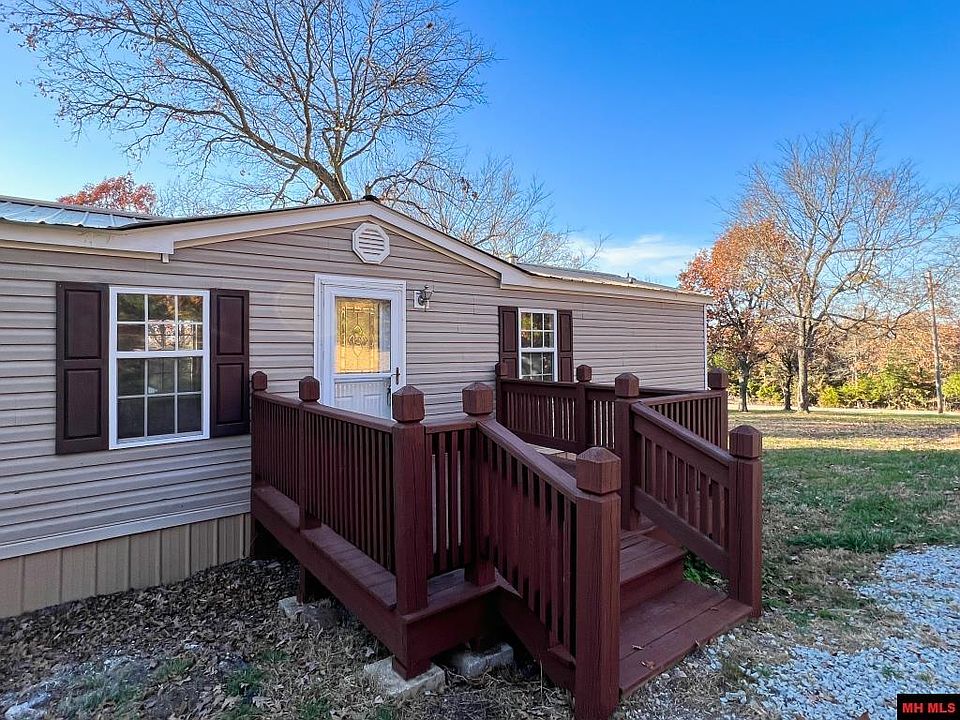 Nice single wide mobile just 5.3 miles from Bull Shoals Lake access at Oakland AR. This 3 bedroom, 2 bath home has many updates including appliances, flooring, lighting, and fresh paint. Large eat in kitchen with island and lots of cabinet space. Split bedroom plan with dual sink vanity and step in shower in master bath. Wired for ADT security and NEXT high speed internet. Outside you will find updated decks on the front and back, 16x16 shed with loft and electric that would easily convert to a bunkhouse, and 2 acres of land that is mostly cleared with plenty of room for RV's and boats. This would make a great vacation home with very little maintenance and a short drive to the lake!