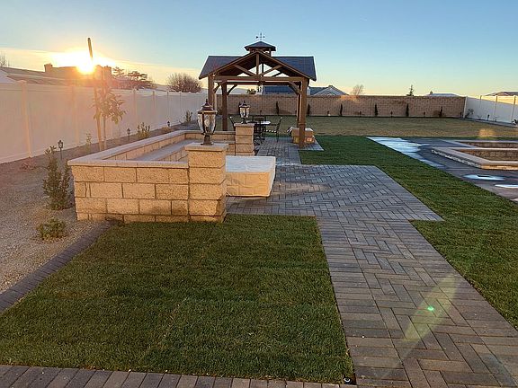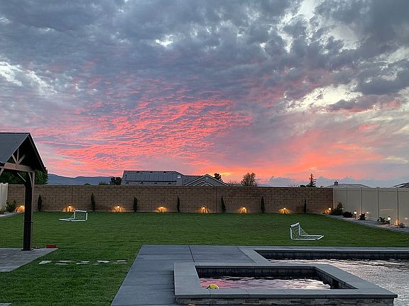 Large home with many custom features, including iron front door, large, completely finished backyard space, including gazebo & pergola, fire pit area, large paver stone patio, large custom pool and jacuzzi, large grass area, water fountain, landscape lighting, sprinklers, and solar parking lot lights. Additionally, this home has 3 bedrooms with en-suite bathrooms, remodeled bathroom downstairs.