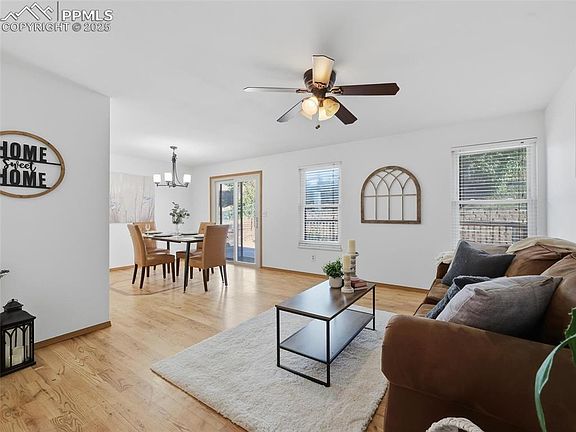 This beautifully maintained home is perfectly located just minutes from Fort Carson, with quick access to I-25, shopping, and dining. Offering comfort, convenience, and thoughtful updates throughout, this 3-bedroom, 1-bath home is truly move-in ready. Step inside and you will immediately notice the hardwood floors that flow through the main living spaces, including a stylish inlay detail in the dining room. The kitchen is a chef’s delight featuring granite countertops, knotty pine cabinetry, and a gas cooktop and stove. Storage will never be an issue with three pantries, two of which include custom pull-out shelving for easy organization. The bathroom is designed with comfort and accessibility in mind, featuring heated tile floors, a large soaking tub, and an ADU compliant walk-in shower. A gentle ramp to the front door adds to the home’s accessibility and convenience. Out back, enjoy Colorado living on the spacious wood deck, perfect for entertaining or relaxing under the open sky. The upgraded patio doors with built-in blinds offer easy access to the deck and yard, where you will also find a storage shed for all your outdoor essentials. A two-car carport and an additional two-car garage provide ample parking and workshop options. The home also features air conditioning for year-round comfort, and the roof was replaced in 2025. This home combines comfort, functionality, and charm in one exceptional package. Do not miss your chance to make it yours.