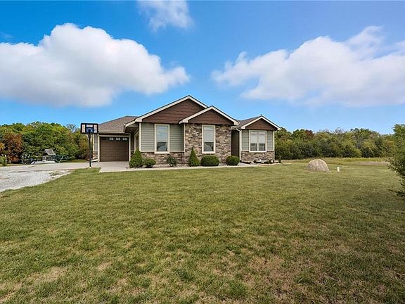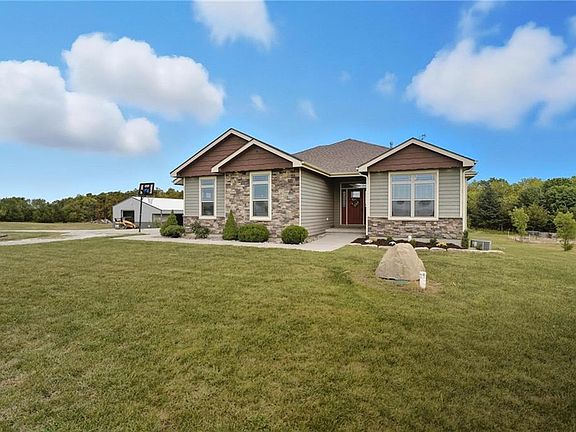 BACK ON THE MARKET THRU NO FAULT OF THE HOME/SELLER SIDE. OPPTY. IS OPEN! Exec.-style 4 bdrm./1 ofc., 3 bath, 3 car gar. home w/a handsome shop, w/heavily timbered acreage backyard, paved road, easy access to everywhere, a rare find. An inviting open layout, gorgeous hardwoods, revealing the hub of the home-the liv. rm., kit. & din. area. The beautiful kitchen features recessed lighting, granite countertops, a center island, walk-in pantry, built-in hutch, dbl. sinks, ss appl., task lighting. Lg. windows fill the space w/natural light & frame your rural scenery. The lg. primary suite is a true retreat, featuring coffered ceilings, abundant windows & tiled bathroom with a private water closet, double granite vanity, and a “wow” walk-in shower/seat. The large walk-in closet includes custom built-ins. Bdrm. & closet connect conveniently to the laundry room. A 2nd bedroom and full bath are also located on the main level, both finished in soft, neutral tones. The wide staircase is a pretty focal point in the home, leading to the lower level-home to a spacious family room with a gas-starter fireplace, wet bar, game closet and custom shelving. You’ll also find two more generous bedrooms, another full tiled bath, and a spacious home office. Other pluses-a dedicated storm shelter & storage area in the unf. part of bsmt./utilities. This home truly has it all-the perfect blend of comfort, luxury, privacy, and nature. It feels nearly new and showcases quality craftsmanship in every detail. Addl. ext. features include a 3-car attached garage, a lg. backyard deck, covered patio, recessed soffit lighting for your landscaping, covered entry way, garden beds, 4 wheeler trails & your own private hunting spot/nature exploration. An amazing 40x30 shop equipped with a 200-amp electrical panel, an 8-ft. covered overhang, an RV door, standard door & man door. Located on a paved road just off Hwy 59, this exceptional rural property offers easy access to major hwys. Click on the video!