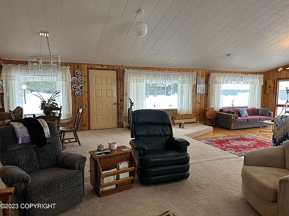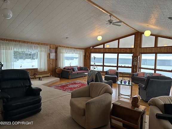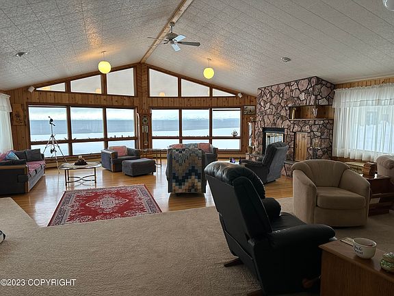 Over 2 acres with well kept bluff front home and plenty of beautifully landscaped yard. Views are incredible from the enormous living room windows of the BREATH TAKING COOK INLET and WEST SIDE MOUNTAINS. Enjoy the covered porch and 1,024 Sq. Ft. garage. Easy to show after the 10th.