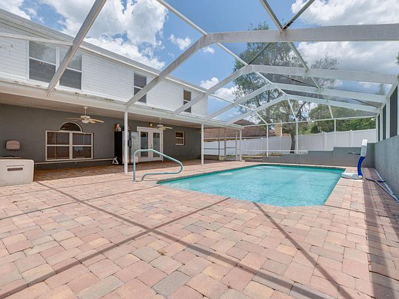 EVERYTHING a family needs AND wants is here! Abundantly spacious family pool home on a family friendly street with a white attractive fenced-in yard. Screened-in entrance for those lovely cool breezes from front to back, welcoming foyer, formal dining and private den or living room. Open kitchen with a center island, that already has plumbing for a sink if desired, breakfast nook and large family room that looks out to the sparkling pool with attractive paving stones. Upstairs bedrooms with a roomy Full Master suite convenient second floor laundry, which is rare for this floor plan. Walk out to the pool area that is private and great for entertaining. Come see all this home has to offer today!