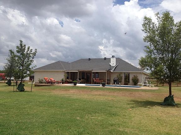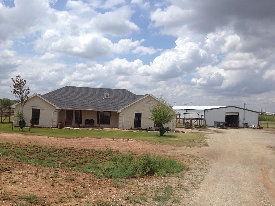 Unique horse property on almost 9 acres just on the edge of city limits! 3/2/2 contemporary brick 1900 sq. ft. home built in 2003 with 4800 sq. ft. (120 x 40) finished barn with concrete aisles, electricity, 900 square ft. apartment with central air, fluorescent lighting, hot/cold water, 220v, rv hookups, and many 110v outlets. Hot/cold water in utility sink. 7 large horse stalls and room to expand. Water connections at each stall. 16 x 32 in ground diving pool with new 30 ml liner and salt water system. Wood deck, pergola, rain gutters. Security system. 8.9 irrigated, fenced acres includes stocked deep pond and small creek. Master bedroom includes walk in closet with built ins and French door leading to patio/pool area. Master bath features Jacuzzi corner tub with skylight, glass shower, his/her sinks, granite counter tops and custom cabinetry. Great room features beautiful west facing windows and French door toward pasture and pond. 11 ft. ceilings, gorgeous architectural lighting, custom rock corner wood burning fireplace, Avanza quartz granite countertops in kitchen with detail custom backsplash, beautiful custom cabinets, and detailed tile flooring. Skylight over center kitchen aisle/workspace (w/outlet) Reverse osmosis drinking water, instant hot water tap. Surround system prewired and outdoor speakers in pool/patio area (cable/TV connection on patio also) Hardwood flooring throughout great room and hallways. Tile in both bathrooms. Carpet in bedrooms. Spray foam extra insulated, low E windows and energy star appliances. Large finished attic with drop down ladder above oversized insulated garage. Barn apartment has central air, 1 bedroom, living room, kitchen, and large bathroom with shower and washer/dryer. Extra room in the barn is 10 x 12, air conditioned, and heated. Good for a workroom or office. Barn apartment has wireless internet, cable TV/satellite connections, carpet and tiled floors. Great for mother-in-law suite or extra rental income. Property has a pipe fence entry, pipe fencing barnyard, pipe fenced run with lean-to shelter. 2 sides of pasture have smooth wire, and 1 side of pasture is barbed wire. No neighbors on either side or across the road. Home is set back about 400 ft. from road. Peaceful, quiet private setting with 2 steel gates at entry. Electricity at front gate for adding lighting or automatic gate opener. Home is all electric. The best feature of the home is the west facing great room windows and backyard that look out and toward the back pasture across red piped fence toward the pond. The flow of the open great room through the French doors to the pool patio area makes this home ideal for entertaining. Enjoy entertaining and relaxing on the patio while you look out on your horses, and beautiful amazing Texas sunsets. Enjoy fishing in your own stocked pond and creek that runs through the back pasture. Front pasture has manicured large mesquites along Clyde Morgan, and a ranch type entry and attractive red pipe fencing. Outbuildings for farm equipment and hay storage. Some farm equipment including tractor and implements, red outbuildings and round pen are negotiable as part of sale or for sale separately.